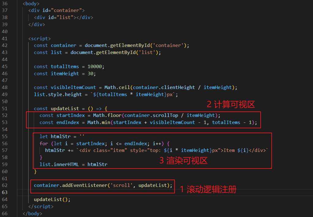 - 滚动逻辑注册:虚拟滚动是在大数据长列表滚动过程中,只渲染用户可视区部分,因此63行代码需要注册DOM滚动事件