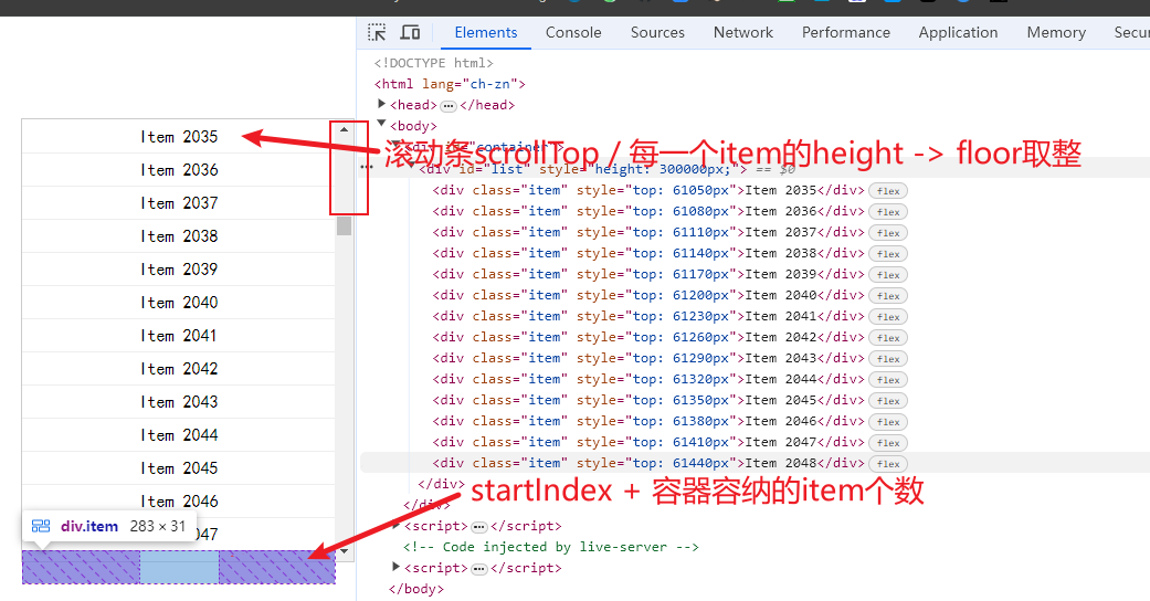 - 计算可视区:计算可视区的第一个列表项和最后一个列表项