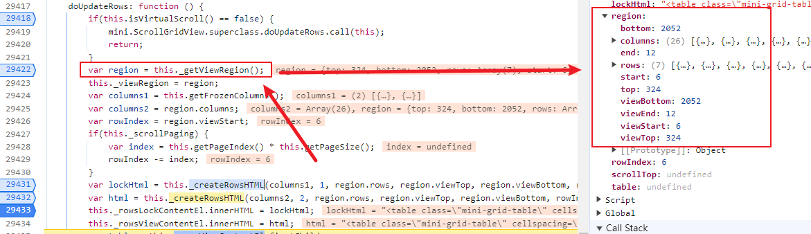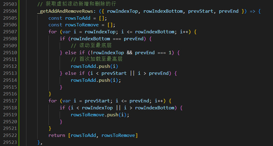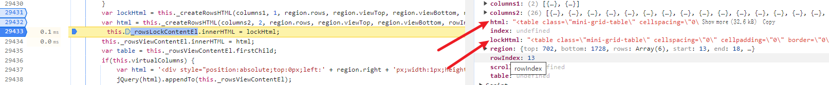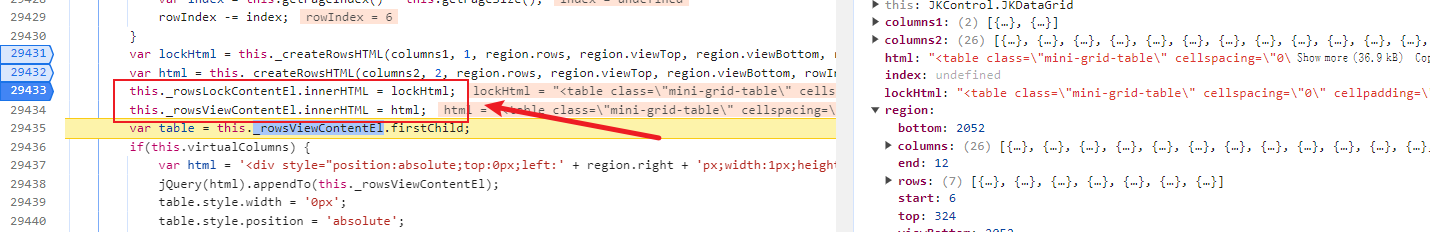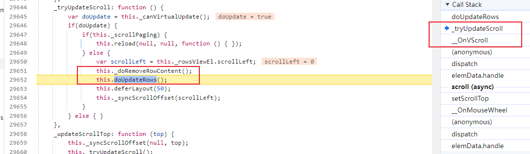滚动过程首先执行了_doRemoveRowContent摘除固定列和非固定列下的各自table标签,这个逻辑是重复执行的,因为对于虚拟滚动情况,后续的innerHTML已经存在更新DOM的逻辑,而且中间也不存在相关中断(return)代码逻辑,故这部分代码可以做判断执行。