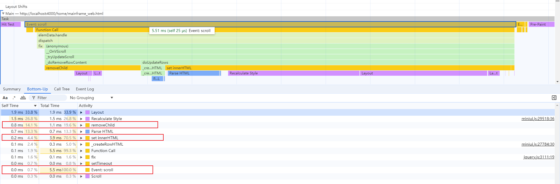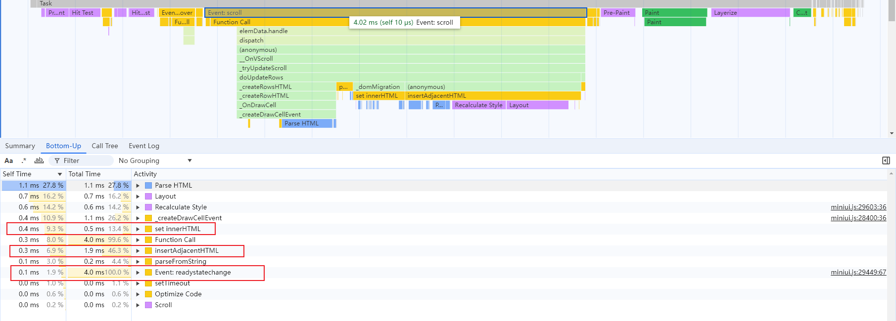 从上图可以看到整个滚动执行逻辑,百分之九十以上的逻辑都是DOM操作(removeChild和innerHTML)