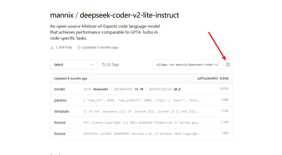 比如我要下载deepseek的deepseek-coder-v2-lite-instruct模型,在https://ollama.com/mannix/deepseek-coder-v2-lite-instruct中点击下面截图的命令执行即可