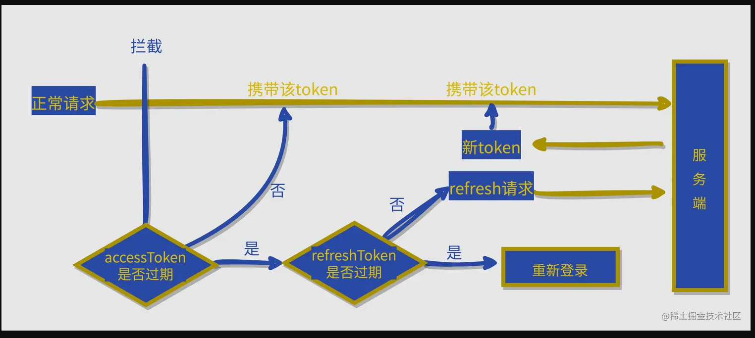 设置两个Token,也就是登录完接口初次返回的,AccessToken和RefreshToken:AccessToken是用于鉴定用户身份,请求每一个接口都需要携带AccessToken;RefreshToken为刷新前者的接口所携带的token,也就是当AccessToken失效时候,调用接口携带RefreshToken返回新的RefreshToken和新的AccessToken,然后自动将新的AccessToken放到接口中重新请求,整个流程为无感操作,提升用户体验。